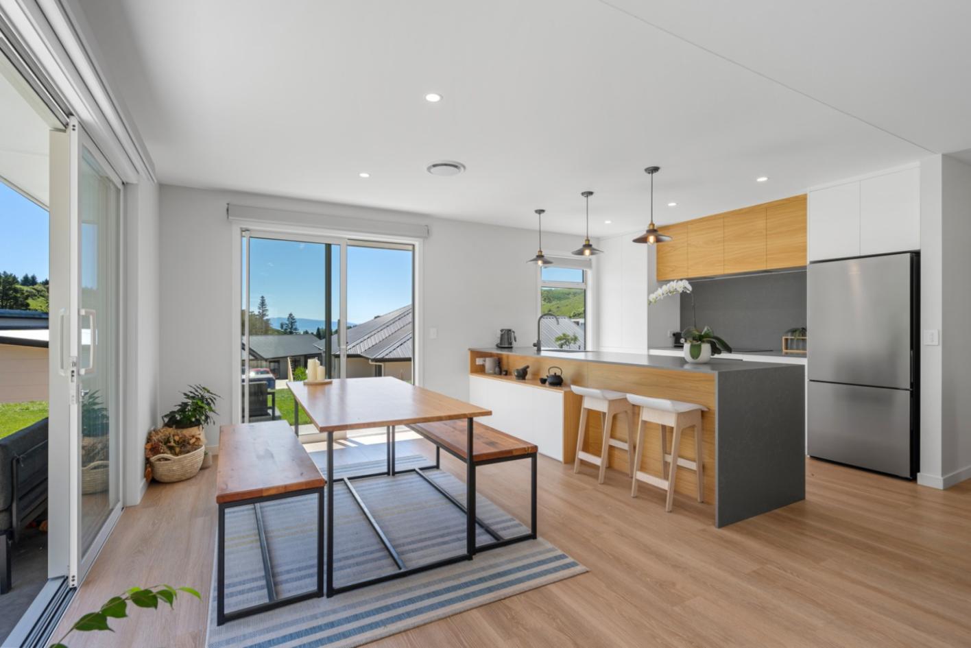 When you walk through the front door, you get a glimpse of the view from two sets of sliding doors out to the lush green lawn and established trees beyond. It invites you to living hub of the home. There is also a seaview from the third set of sliding doors.
