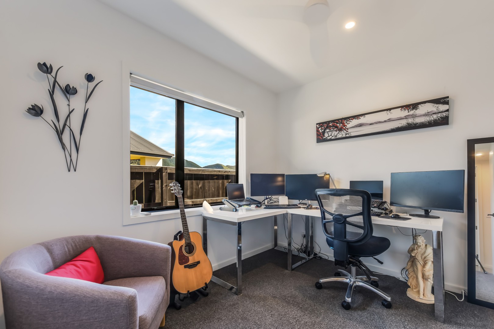 At the heart of the home lies an open-plan kitchen, dining, and living area that seamlessly connects to multiple decks - perfect for entertaining or relaxing with breathtaking water and mountain views. A separate lounge offers a cozy retreat, and a discreet office nook hidden behind cavity sliders provides functionality without compromising the home's aesthetic. High-stud ceilings and premium finishes throughout create an atmosphere of space and elegance.
